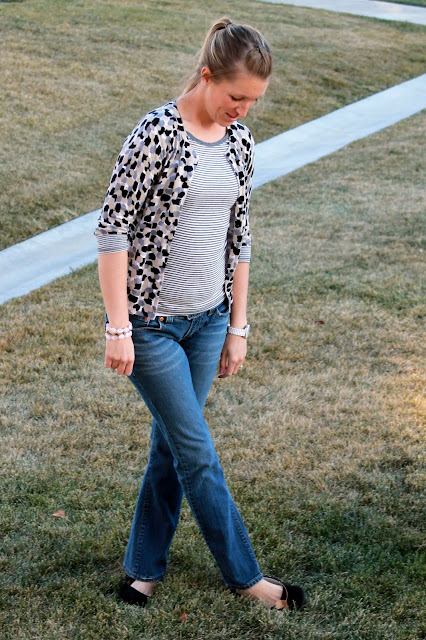 I like the mix of prints, the cardi looks really cute. Oh..I love the flats too. Your weather seems erratic, but it's good to be able to do a outdoor outfit post. I'm still waiting for the miserable rain to stop